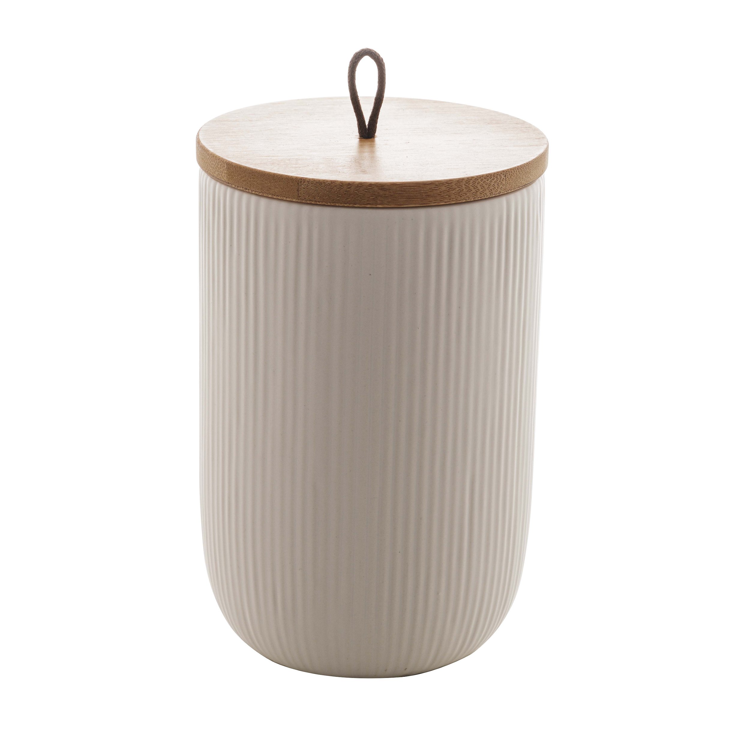 Aprimore sua decoração com o Potiche de Cerâmica com Tampa de Bambu e Pegador de Corda Lines Branco 10cm x 10cm x 15cm da Lyor.