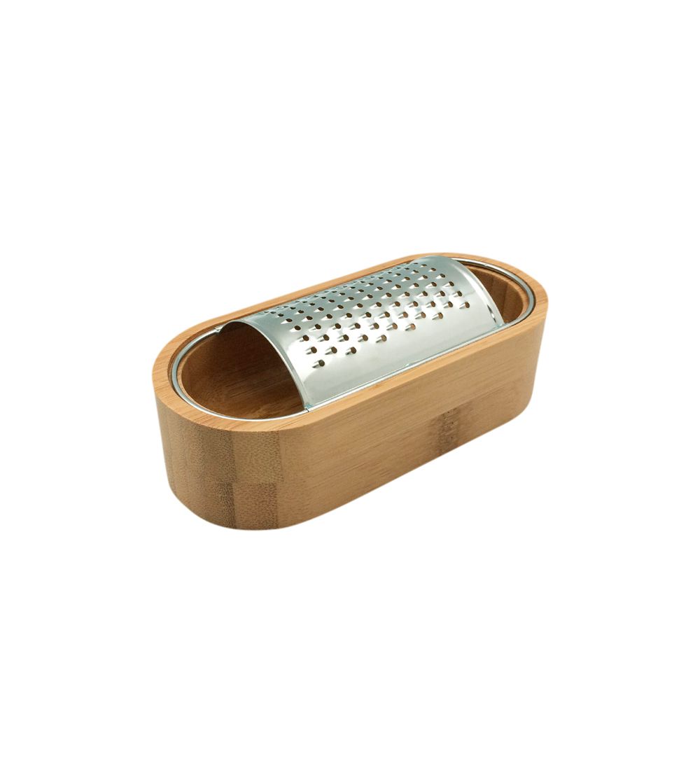 Para ralar e servir. Linda peça composta por ralador em aço inox e recipiente em bambu, facilitando na hora de ralar queijos, chocolates, entre outros. Para servir ou transportar o alimento basta desencaixar o ralador. Sua principal vantagem é que ele possui um bactericida natural, o que diminui muito o risco de contaminação. Além de ser um acessório leve, ele é pouco poroso e fácil de limpar.